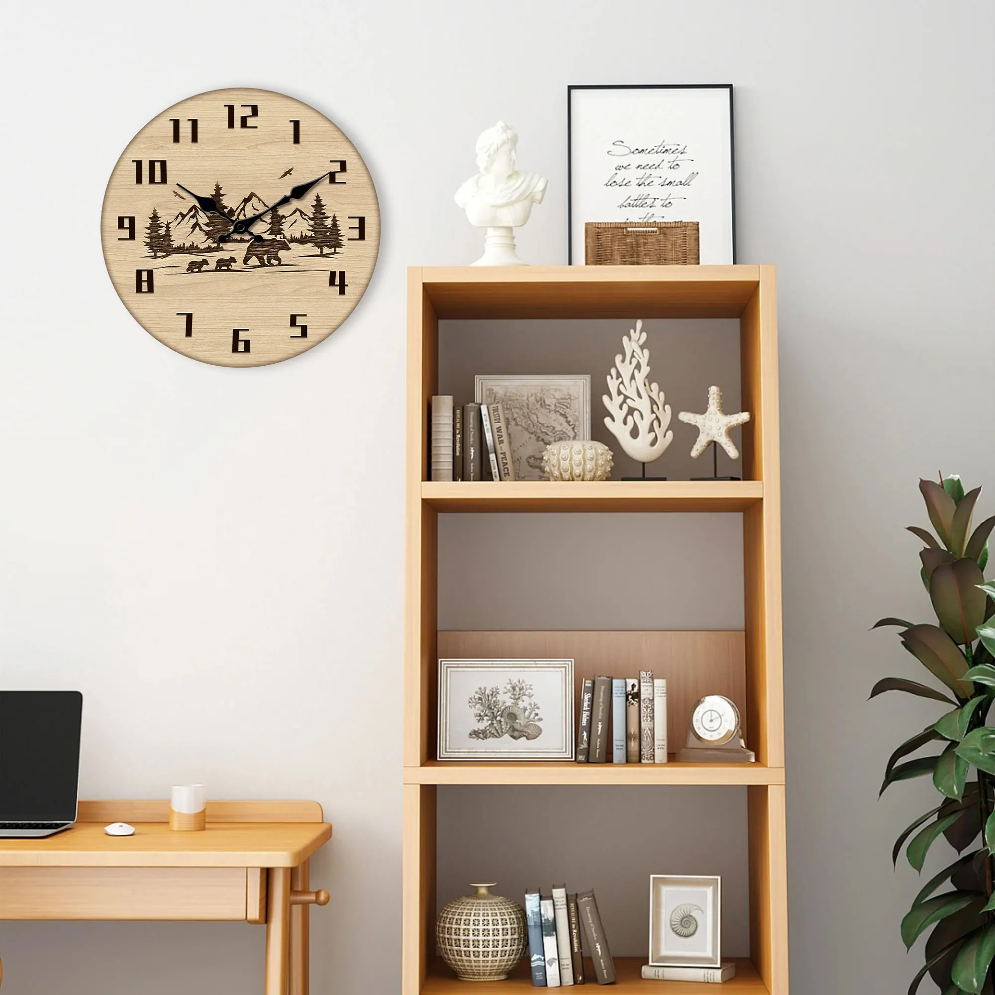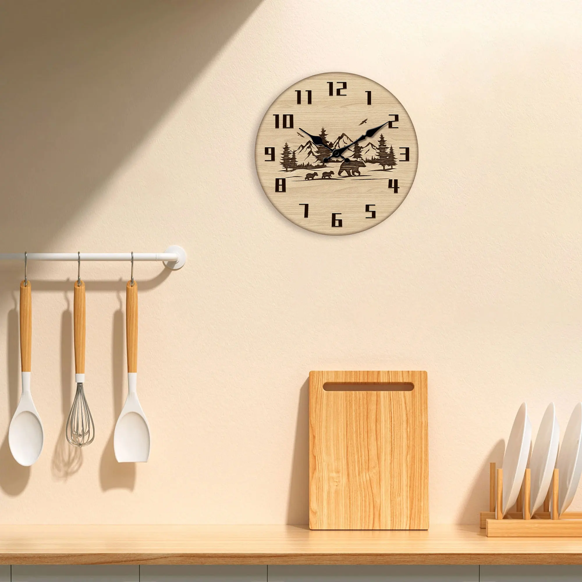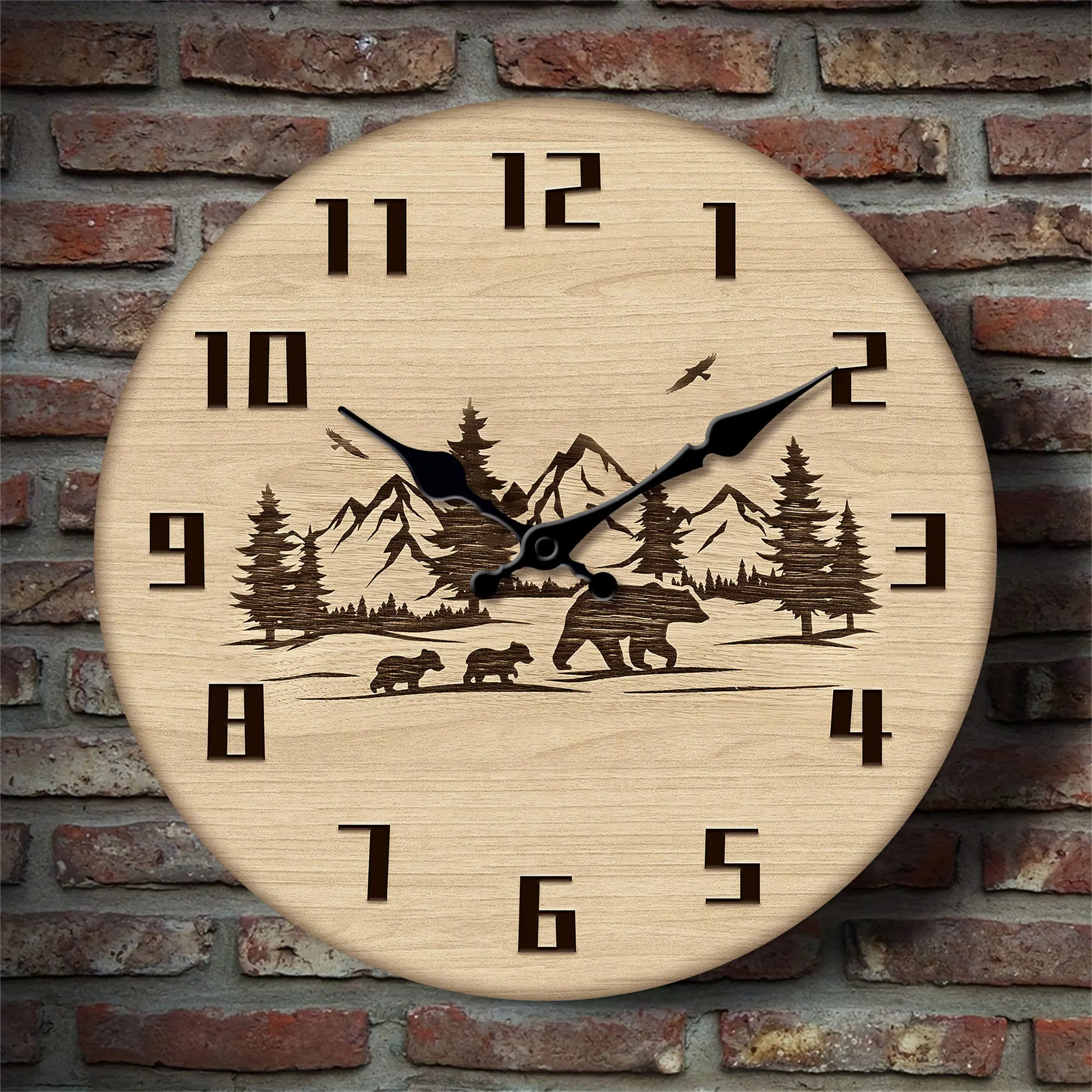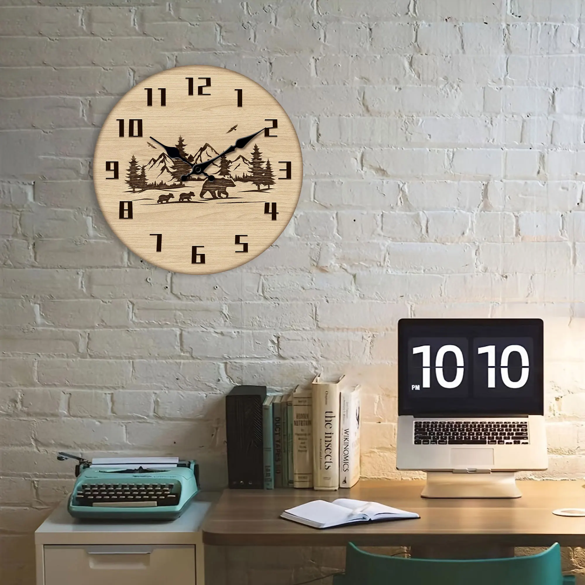 1Pc Round Wooden Bear Wall Clock, Forest Wildlife Cabin Wall Clock, Silent Clock, For Living Room Bedroom, Room Decor, Home Deco