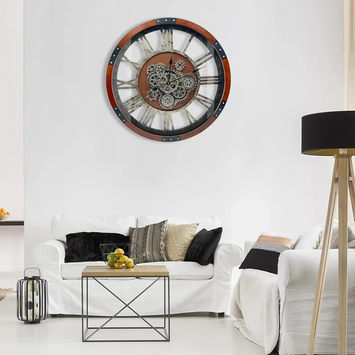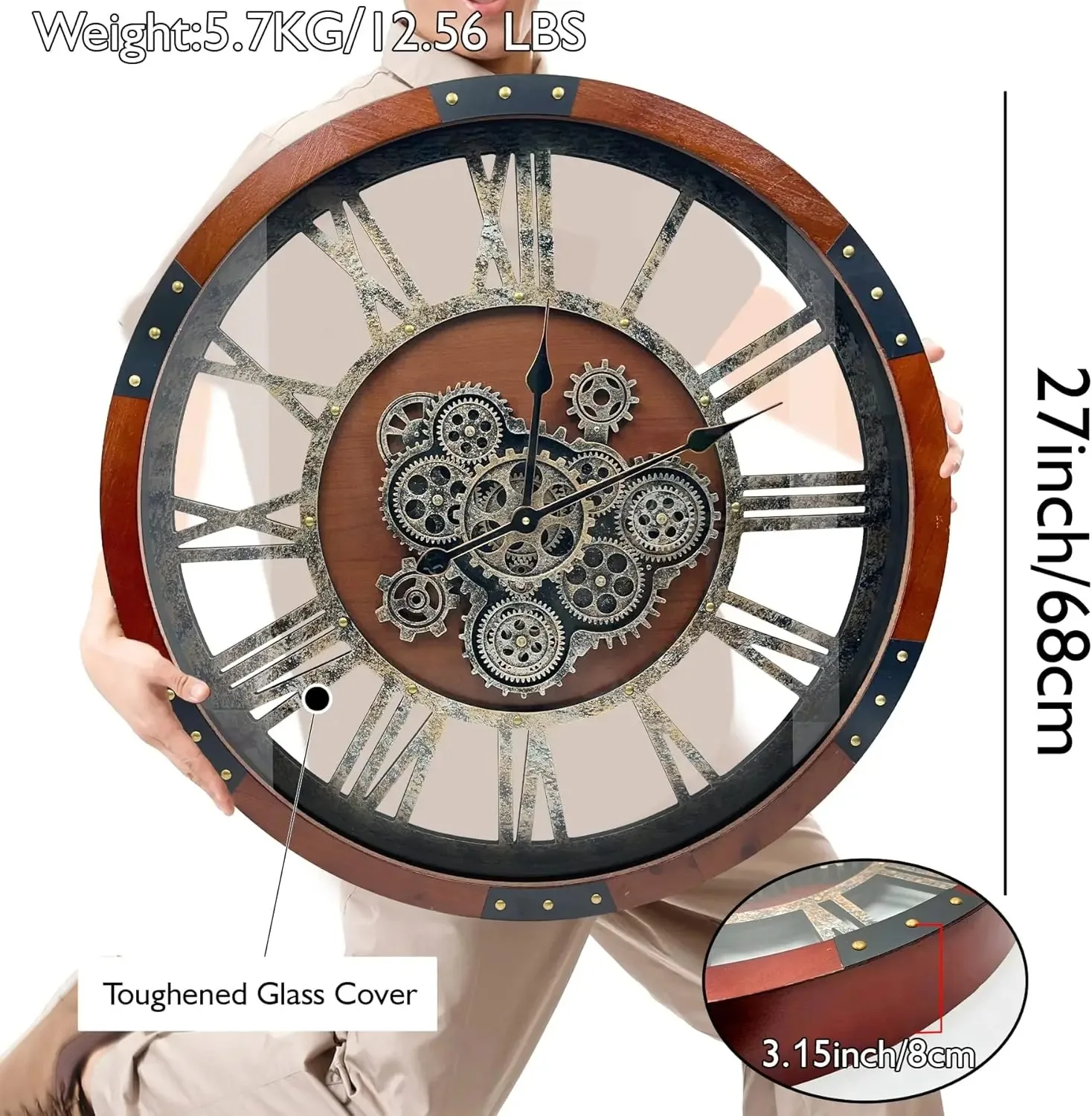 Wall Clock 27" Original Moving Gears Wall Clock, Large Industrial Wall Clock For Living Room Decor, Retro Metal Solid Wood