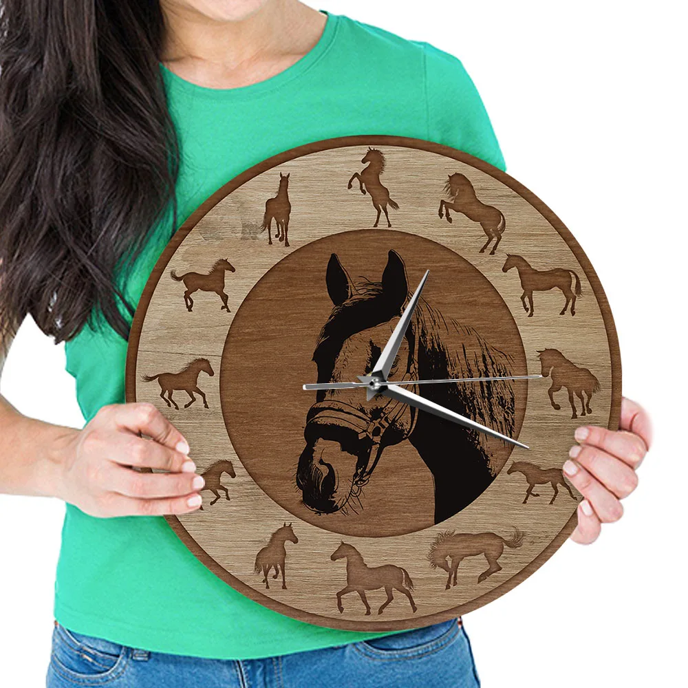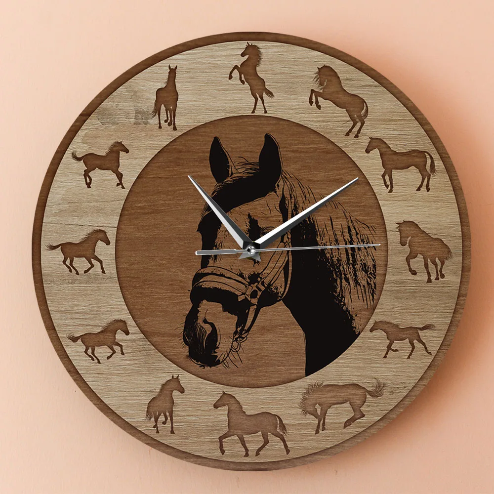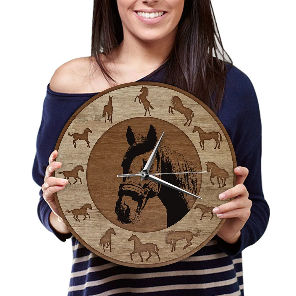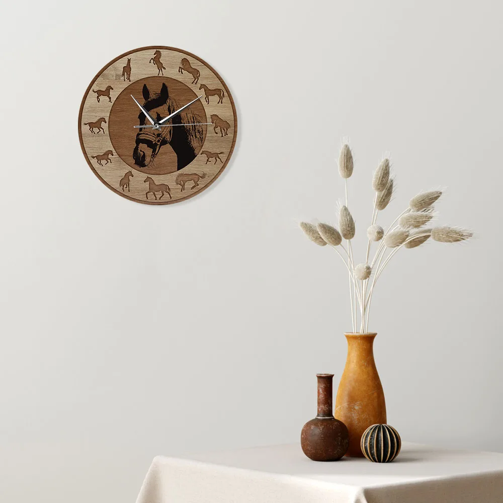 Farmhouse Style Horse Silhouettes Wall Clock Wood Grain Texture Printed Wall Clock Running Horses Art Home Decor Equestrian Gift