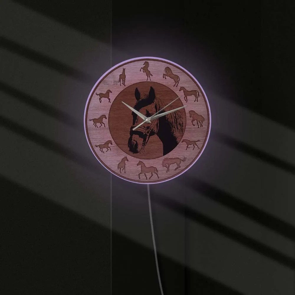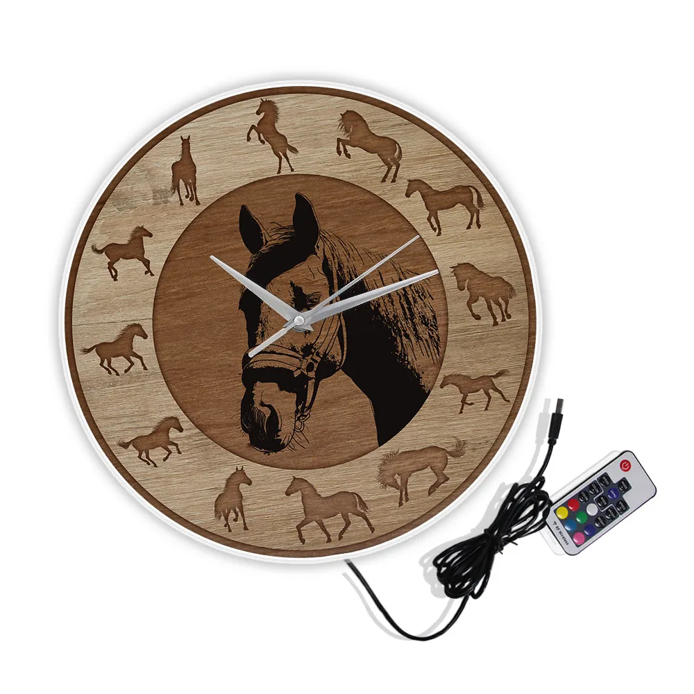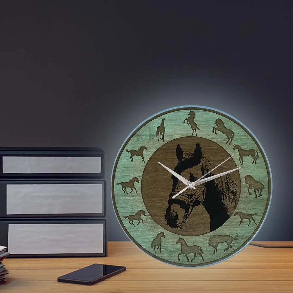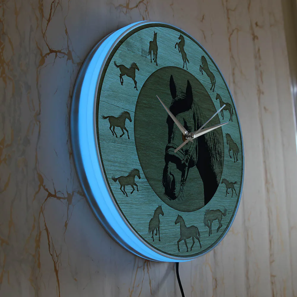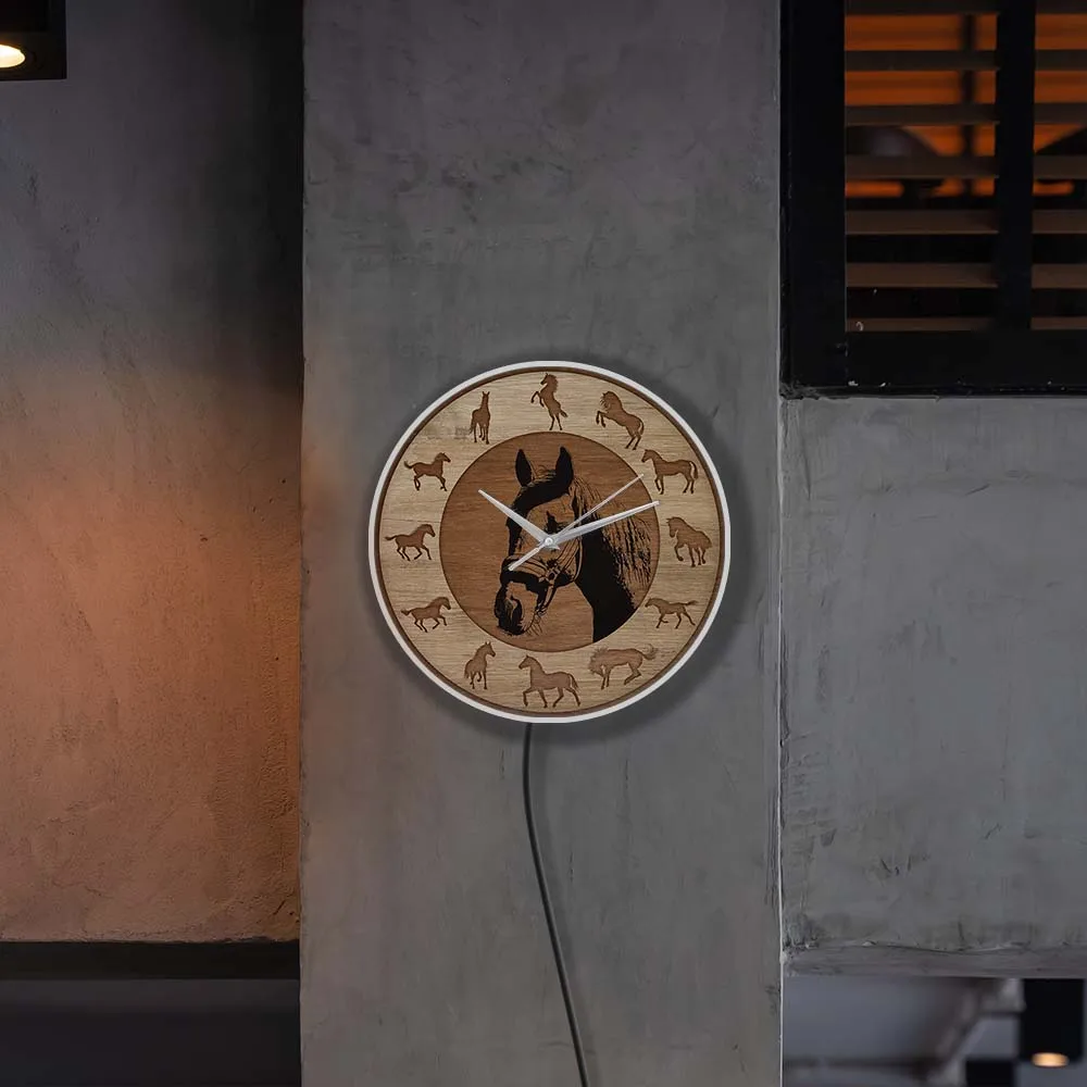 Running Horses Silhouettes Wall Clock Wood Grain Texture Printed Wall Clock Color:White Frame With LED