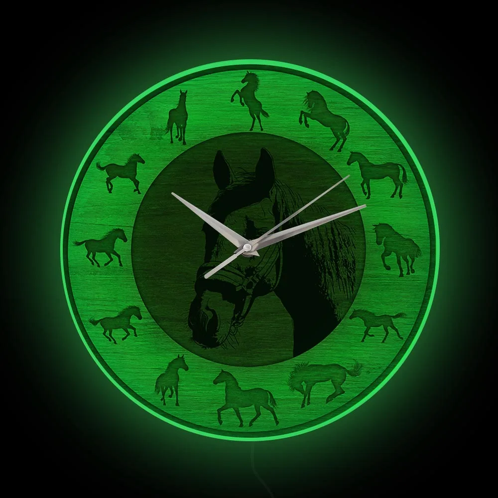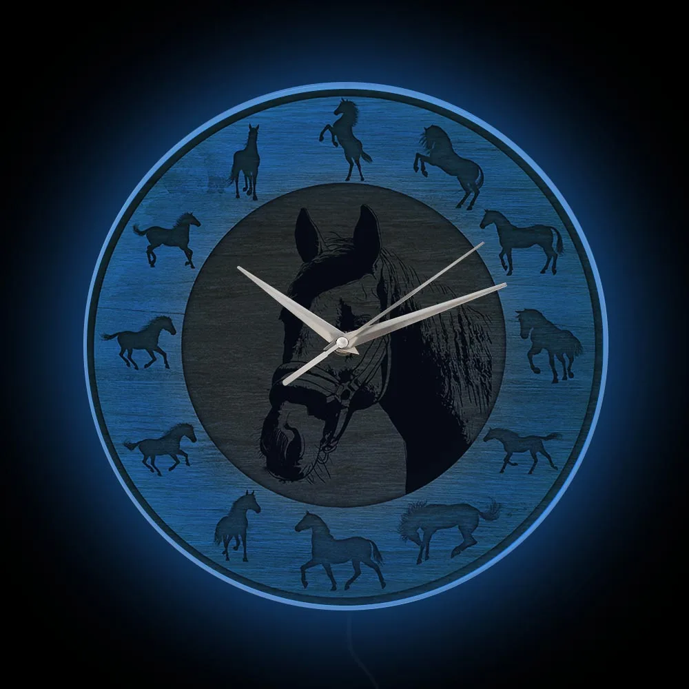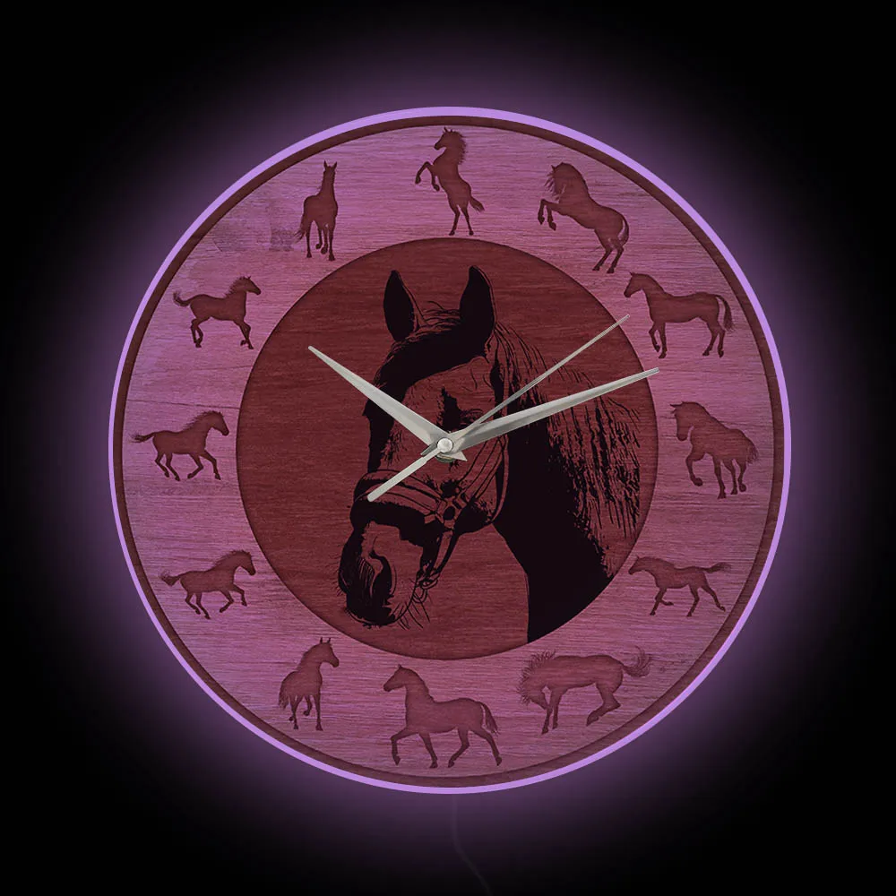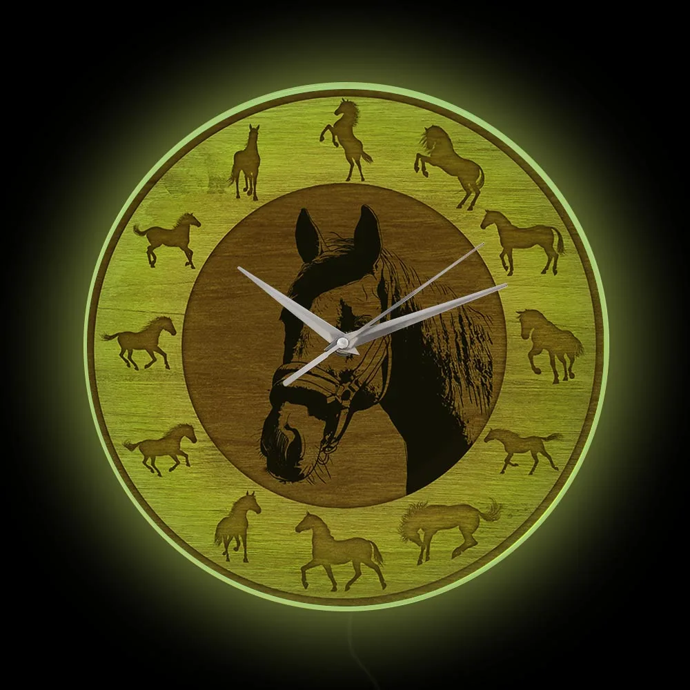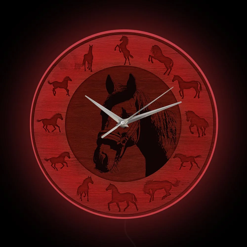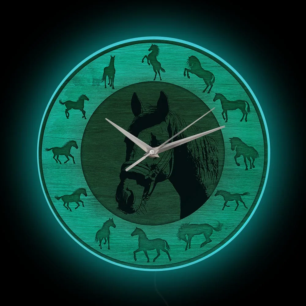 Running Horses Silhouettes Wall Clock Wood Grain Texture Printed Wall Clock Color:White Frame With LED